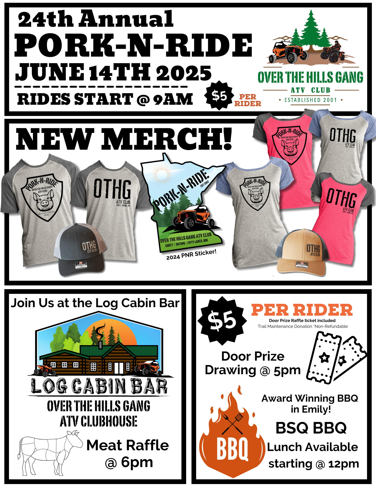Pork-N-Ride: June 14th, 2025 Polaris Ride Command routes Download the GPX file for your ride! Event & Group Ride Parking Guided Group RidesGroups are limited to a maximum of 25 vehicles.Ride #1 Ride #2 Ride #3 Ride #4 Ride #5 Ride #6 Ride #7 Ride #10 Ride #8 Ride #9 Group Ride Etiquette Click Here to View Group Ride Etiquette Plan Your Ride: Emily/Outing ATV Trail GEO PDF Map MN DNR Website Polaris Ride Command Website Lodging & CampingClick here for the interactive mapTrail Parking AreasClick here for the interactive mapGas OptionsClick here for the interactive mapFood OptionsClick here for the interactive map